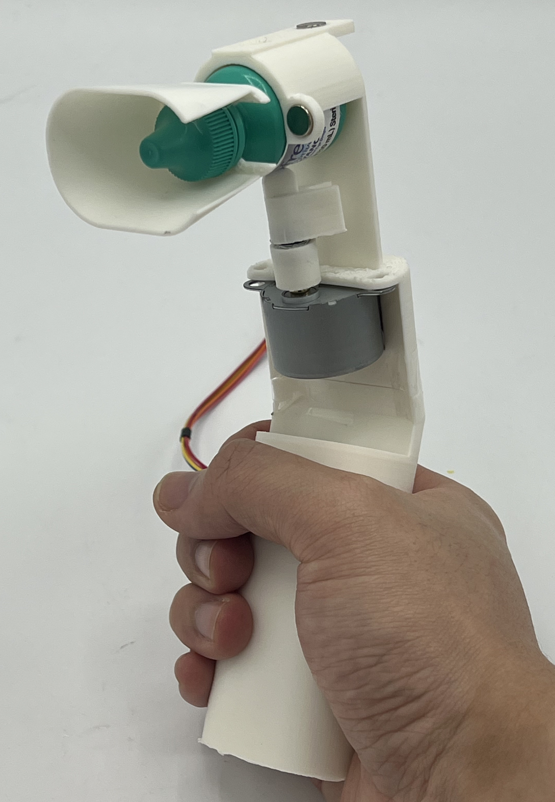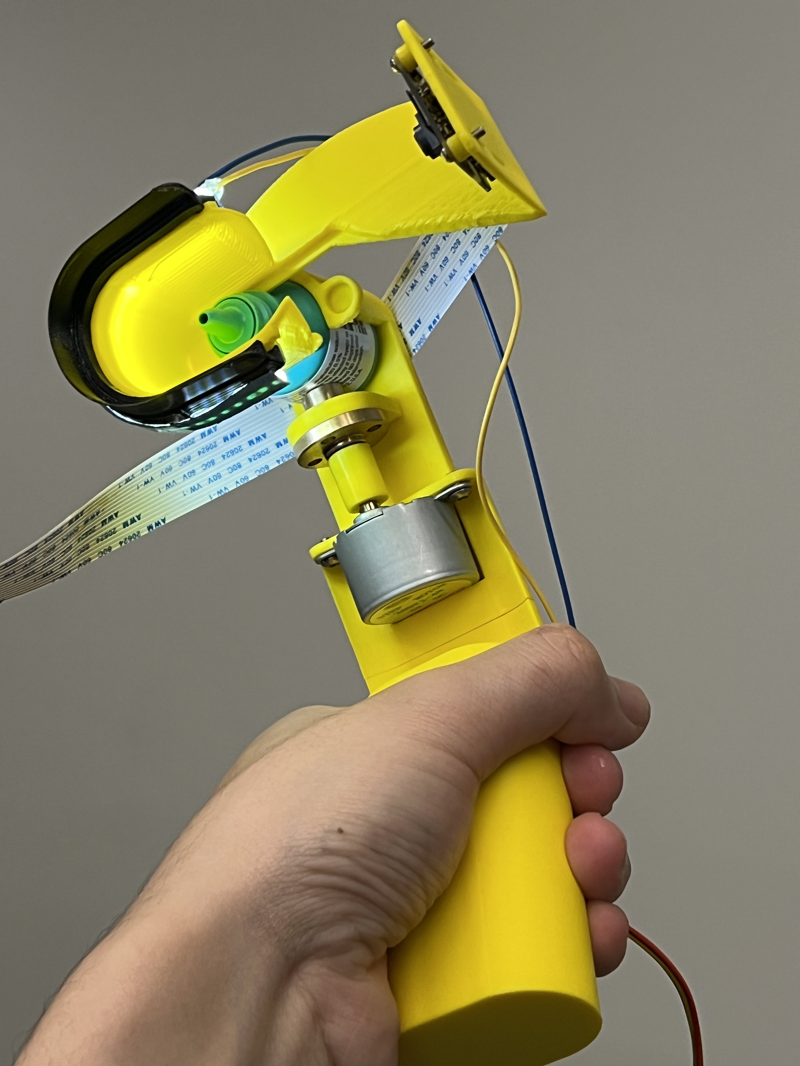 I integrated the motorized squeezing mechanism into a handheld device that also provides aiming assistance through a cap that rests around the eye for alignment.